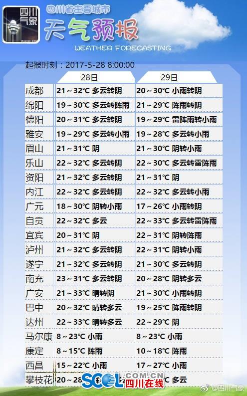 29日白天到晚上:盆地西部北部阵雨转多云,其余地方阴天间多云有阵雨或雷雨,南部局部有中雨;川西高原和攀西地区阴天间多云有阵雨或雷雨,局部有中到大雨。