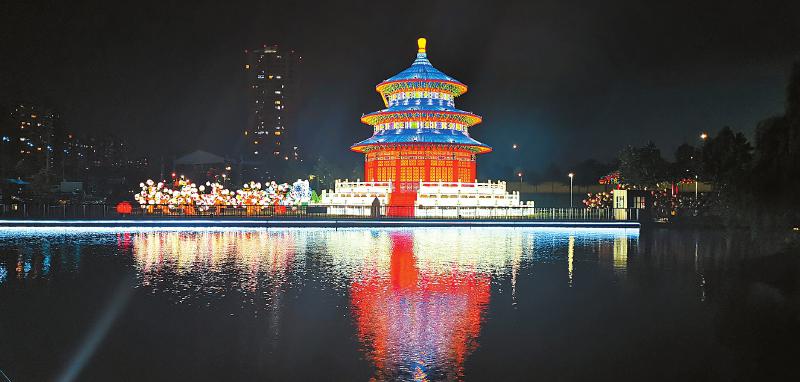 当地时间10月30日,“感知中国·天下华灯”智利中国彩灯节在圣地亚哥开幕。这是自贡灯彩文化产业集团设计制作的《天坛》灯组。自贡灯彩文化产业集团供图