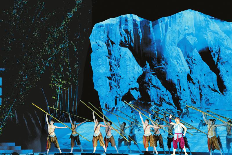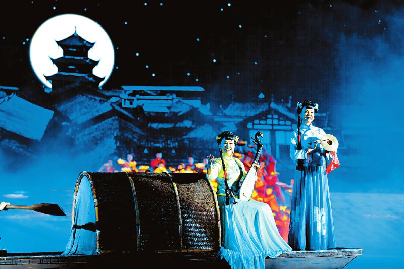 恩阳区市民广场,一座高9米的微缩版古镇里,一条长13米的古道延伸开来,旁边连接着一条蜿蜒的实景水系。在这三个独立表演的空间,巴中儿女载歌载舞,耕种、秋收、放河灯、打铁、走千山等巴人文化生活被一一搬上舞台,配着“巴”式山歌,歌与景的交融给观众带来一场视听盛宴。