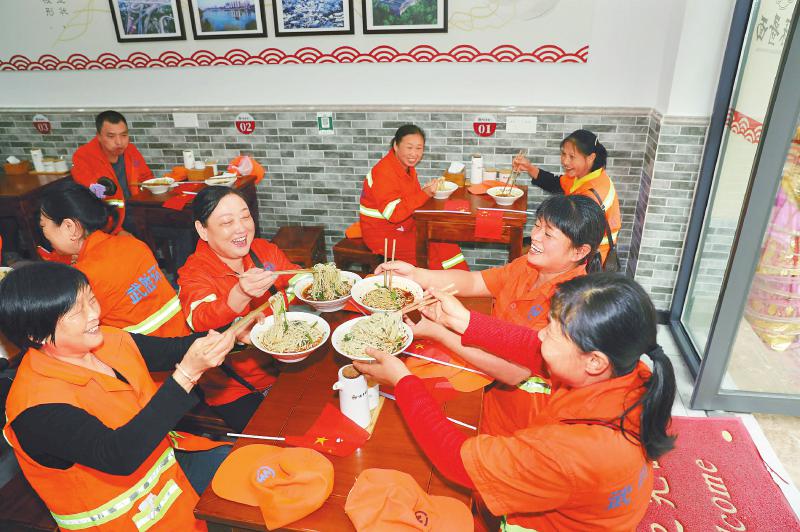中秋、国庆佳节,武胜县用各种方式喜庆佳节。当地环卫部门组织环卫工人们同吃“国庆面”共庆双节。夏俊林 摄