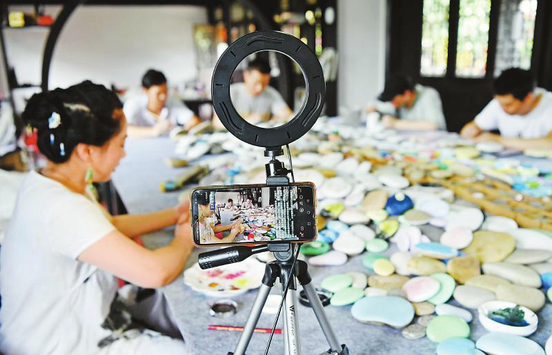 南充市蓬安县非遗传承人卢静利用当地丰富的鹅卵石资源,开发出“嘉陵江石画”系列产品。6月12日,在该县一工坊,画师利用网络平台展示嘉陵江石画制作过程。刘永红 摄(视觉四川)