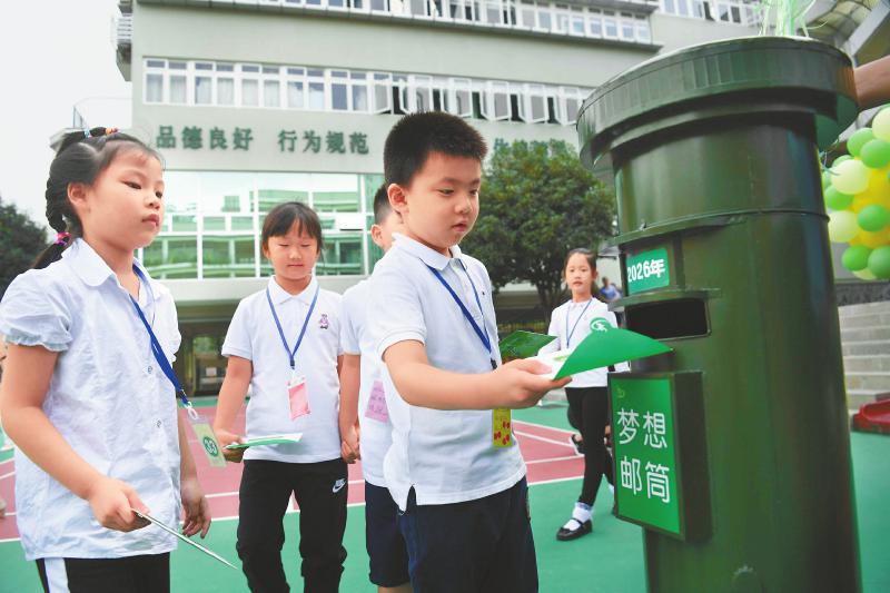 9月1日,成都市龙江路小学200余名一年级新生将一封封满载梦想的“慢信”投进邮筒,寓意梦想在学校生根。(记者 肖雨杨 摄)