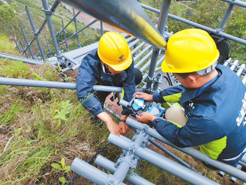 中国电信员工在凉山州昭觉县“悬崖村”的钢梯上调测通信网络