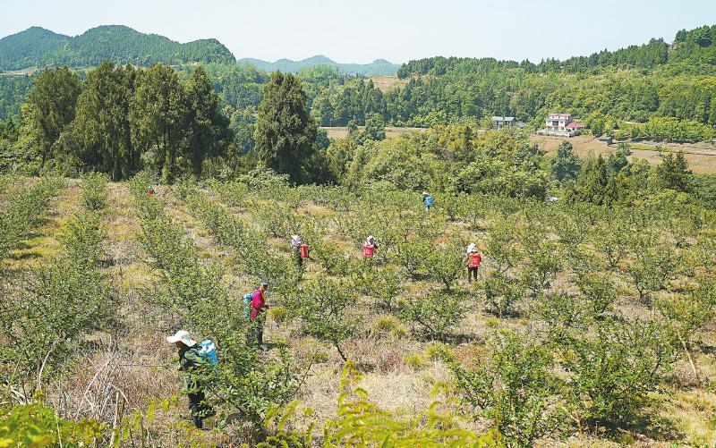 盐亭县西陵镇强化村,工人们正在给青花椒喷洒农药。