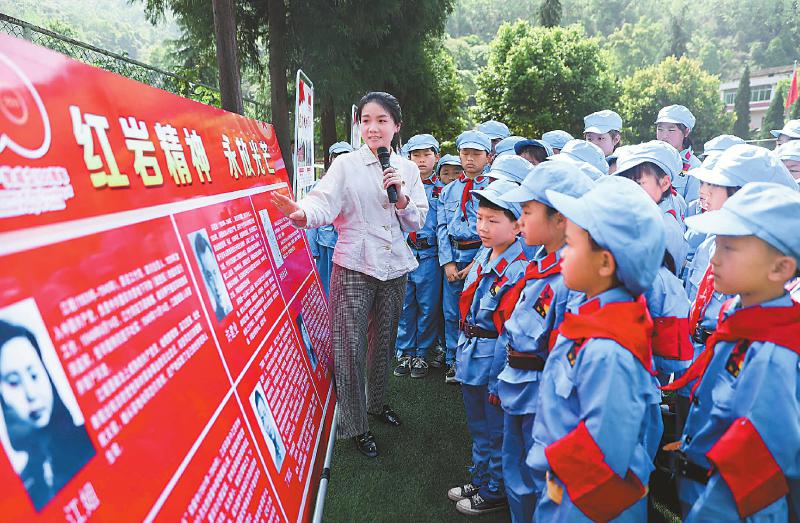 华蓥山是“红岩精神”发源地之一。广安华蓥市红岩乡小学充分利用华蓥山的红色资源,在校园中开展“学党史、知党恩、跟党走”教育活动,通过展览红岩图片和讲红岩故事、唱红岩歌曲、看红岩影视等,对少年儿童开展党史教育和革命传统教育,传承红色基因。图为近日红岩乡小学的党史教育辅导员利用展板给学生讲解“红岩精神”。(邱海鹰 摄 视觉四川)