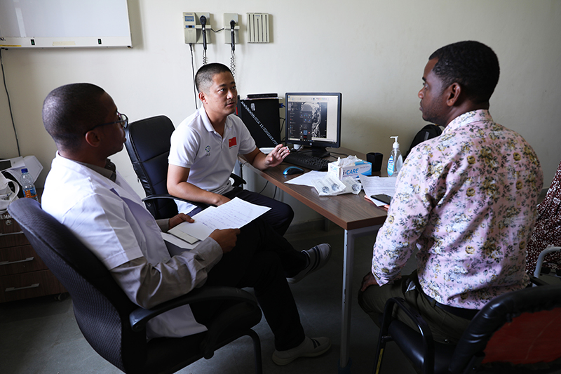 2023年2月22日,在坦桑尼亚桑给巴尔岛纳兹莫加医院,中国援桑给巴尔医疗队成员郭伟(左二)给病人看病。记者 董江辉 摄