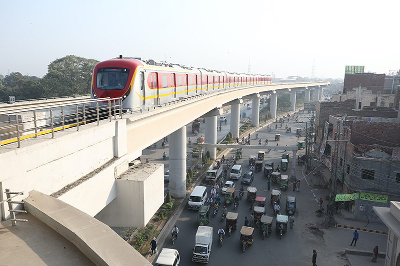 在巴基斯坦拉合尔市,巴基斯坦首条地铁拉合尔橙线一辆地铁列车准备进站(2020年10月26日摄)。记者 刘天 摄