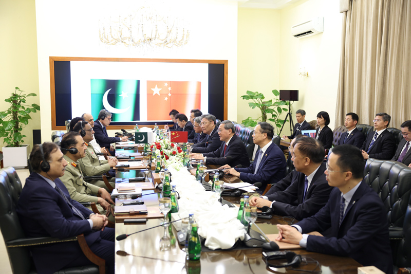 当地时间10月14日,国务院总理李强在伊斯兰堡会见巴基斯坦参联会主席萨希尔和陆军参谋长穆尼尔、海军参谋长阿什拉夫、空军参谋长巴伯尔。新华社记者 丁海涛 摄