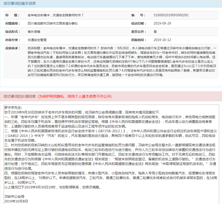 投诉标题:老年电动车横冲,交通安全隐患何时休? 投诉内容 :9月28日,本人骑电动自行车正常通过邛崃市朱水碾街由南往北行驶,一辆老年电动汽车(不知如何定义该车辆)在文君街道办事处外边双实线违规掉头,驾驶该车...