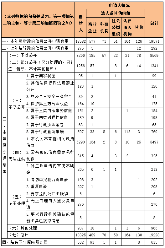 从答复情况来看,2019年,全省各级行政机关答复政府信息公开申请19228件,其余635件结转下年度继续办理。从答复情况看,予以公开和经区分处理后公开的有9910件,占51.54%;因涉及国家秘密、商业秘密等原因(含属于行政查询事项),不予公开的有1618件,占8.41%;因被申请行政机关不掌握相关政府信息等原因无法提供的有6035件,占31.39%;属于信访举报投诉类申请、重复申请等不予处理的有700件,占3.64%;因申请人撤回申请或属于业务咨询等作其他处理的有965件,占5.02%。