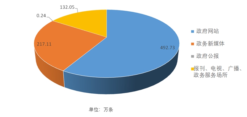 从公开渠道来看,政府网站公开信息492.73万条,占比58.51%;政务新媒体公开信息217.11万条,占比25.78%;全省政府公报刊登政府规章和规范性文件等信息0.24万条,占比0.03%;通过报刊、电视、广播、政务服务场所等其他渠道公开信息132.05万条,占比15.68%。