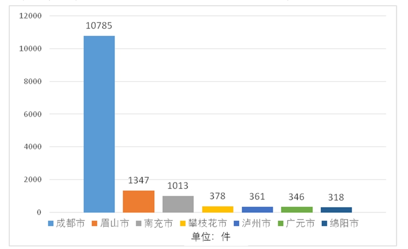 从申请量来看,市(州)申请量列前7位的分别是成都、眉山、南充、攀枝花、泸州、广元和绵阳;省直部门申请量列前10位的分别是自然资源厅、省发展改革委、人力资源社会保障厅、省卫生健康委、省监狱管理局、财政厅、省统计局、住房城乡建设厅、生态环境厅、司法厅和省市场监管局(两单位申请量并列省直部门第10位)。