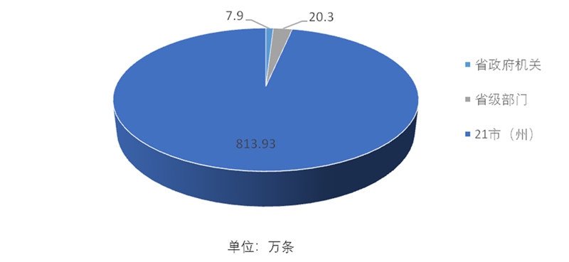 从公开主体来看,省政府机关公开7.9万条,占比0.94%;省直部门公开20.30万条,占比2.41%;21个市(州)公开813.93万条,占比96.65%。
