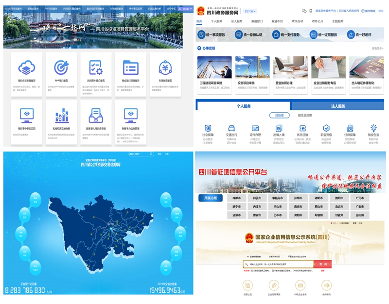 2019年,全省通过四川省一体化政务服务平台,累计公开市场主体和个人办事服务事项138万项,公开办理结果2282.01万条;通过国家企业信用信息公示系统(四川),归集公示注册登记、行政许可、行政处罚、抽查检查等信息363.17万条,历年累计归集公示企业相关信息2843.25万条;通过全省投资项目在线审批平台,公开项目核准、备案、可行性研究报告审批、初步设计审批等立项审批信息共4.17万件;通过全国公共资源交易平台(四川省),累计发布工程建设项目招投标、政府采购交易、土地使用权和矿业权交易、国有产权交易等各类公共资源交易信息13.5万条;依托全国征地信息共享平台,公开经省政府批准的非涉密建设用地批文1109件、征地告知书692份、“一书四(三)方案”675份、征收土地公告和征地补偿安置方案公告1384份。