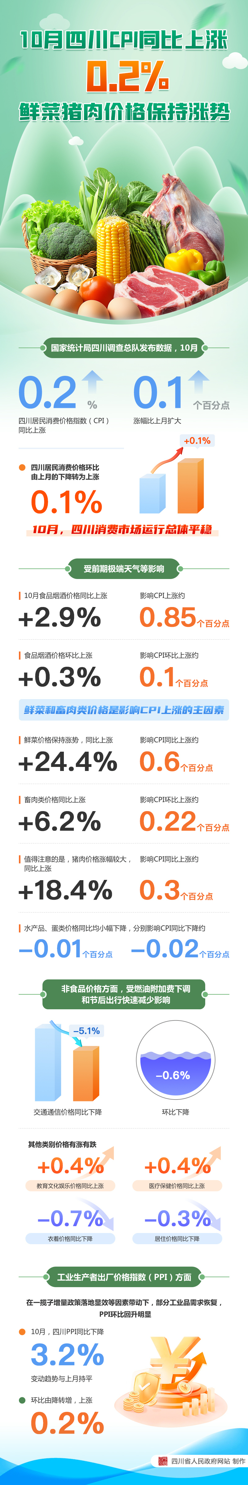 图解:10月四川CPI同比上涨0.2% 鲜菜猪肉价格保持涨势