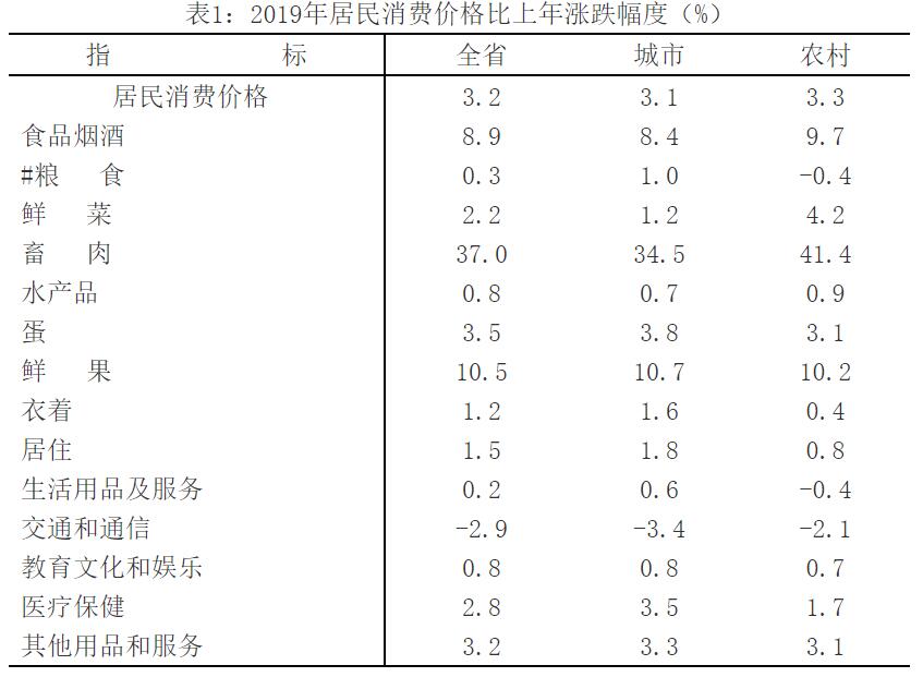 全年居民消费价格(CPI)比上年上涨3.2%,其中医疗保健类上涨2.8%,居住类上涨1.5%,教育文化和娱乐类上涨0.8%,食品烟酒类上涨8.9%。商品零售价格比上年上涨2.7%。农业生产资料价格比上年上涨9.0%。工业生产者出厂价格(PPI)比上年上涨0.4%,其中生产资料价格上涨0.2%,生活资料价格上涨0.7%;工业生产者购进价格(IPI)比上年上涨0.6%。