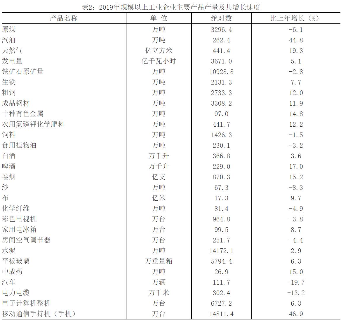 从主要产品产量看,原煤产量比上年下降6.1%,汽油增长44.8%,发电量增长5.1%,天然气增长19.3%,铁矿石原矿量下降2.8%,电力电缆下降13.2%,啤酒增长17.0%,成品钢材增长11.9%,电子计算机整机增长6.3%,白酒增长3.6%,水泥增长2.9%。全年规模以上工业企业产销率为98.5%。