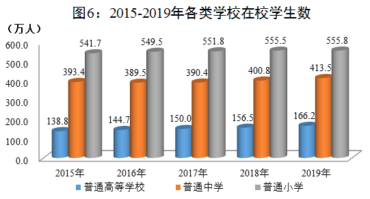 年末共有小学5725所,招生93.4万人,在校生555.8万人。初中3734所,招生94.3万人,在校生273.7万人。普通高中779所,招生48.4万人,在校生139.8万人。特殊教育学校129所,招生0.3万人,在校生(含附设特教班)1.6万人。中等职业教育学校(含技工学校)498所,招生37.7万人,在校生92.7万人。职业技术培训机构4158个,职业技术培训注册学员202.1万人次。