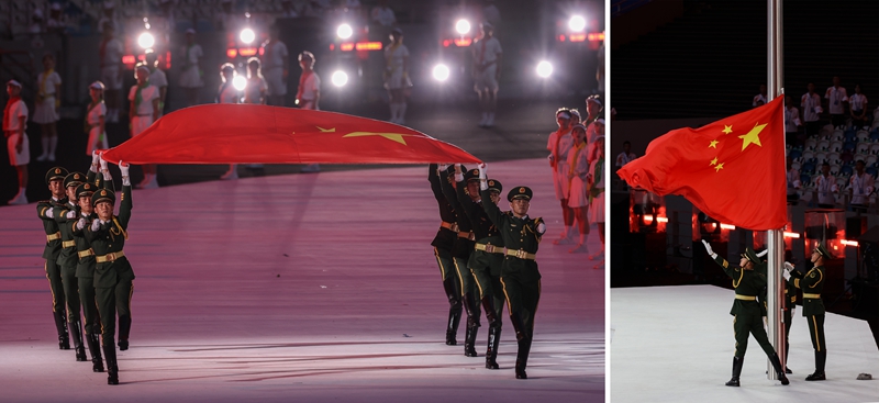 2023年7月28日,四川成都,第31届世界大学生夏季运动会开幕式在东安湖体育公园主体育场举行。图为开幕式上的升旗仪式。