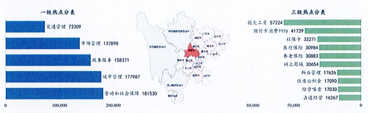 省12345热线热点诉求分析。群众诉求主要集中在劳动和社会保障、政务服务、市场管理、城市管理、交通管理、科教文体等方面。涉及咨询社保业务、医保业务、养老保险、拖欠工资、四川政务网办事、消费纠纷、企业登记、证照管理、商品房质量、高速公路拥堵、教育管理、医政监管等问题(见图1)。