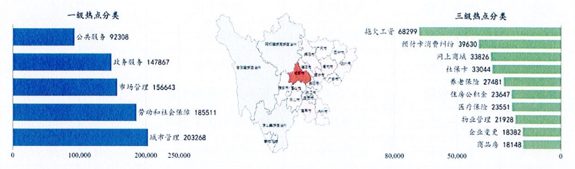 省12345热线热点诉求分析。群众诉求主要集中在政务服务、劳动和社会保障、市场管理、城市管理、交通管理、卫生健康等方面。涉及咨询四川省政务服务网办事、社保业务、医保报销、养老保险、拖欠工资、消费纠纷、企业登记、噪音污染、商品房质量、医政监管等问题(见图1)。