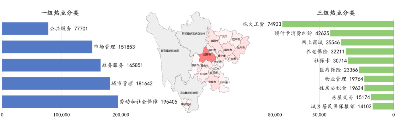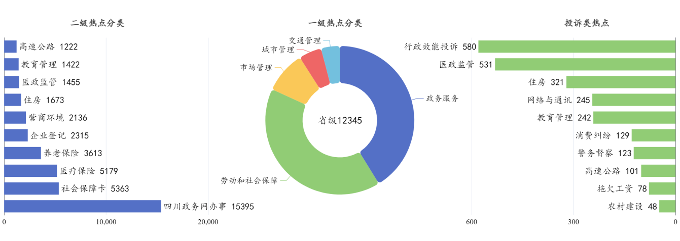 省12345热线热点诉求分析。群众诉求主要集中在政务服务、劳动和社会保障、市场管理、城市管理、交通管理、科教文卫等方面。涉及咨询四川政务网办事、社保业务、医保报销、养老保险、拖欠工资、企业登记、消费纠纷、噪音污染、商品房质量、高速公路拥堵、教育管理、职业职称等问题(见图1)。