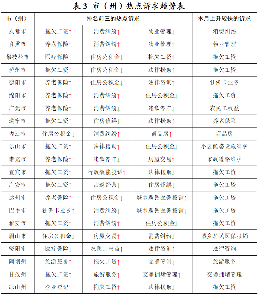 从群众诉求情况来看,房屋交易、农村管理、拖欠工资等诉求较多。受房地产市场政策宽松影响,群众咨询公积金贷款、首套房贷款利率、成都市购房政策等诉求增多;群众对洪灾后补贴发放缓慢、村庄不定期停水停电、道路施工影响人员出行等诉求较集中;因拖欠劳动工资、克扣实习工资、未按劳动合同支付薪水,拖欠工资类诉求较上月有所上升。
