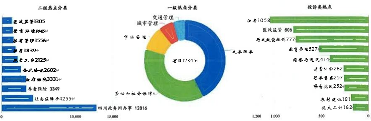 省12345热线热点诉求分析。群众诉求主要集中在政务服务、劳动和社会保障、市场管理、城市管理、交通管理等方面。涉及政务服务网办事、住房公积金、社保医保、劳动保障、企业登记、消费纠纷、市容环卫、噪音扰民、高速公路收费、停车管理等问题(见图1)。