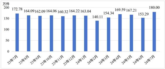 7月,全省12345热线共受理企业群众诉求180.00万件,环比上升17.42%,办结150.25 万件,正在办理中29.75万件,超期率 0.01%。见图1。
