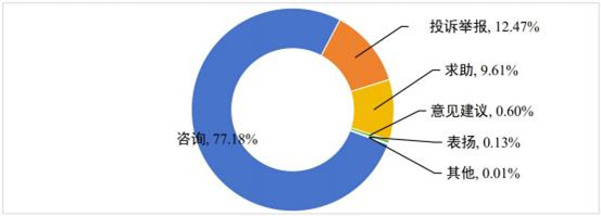 省12345热线共受理企业群众诉求 61723 件,办结 60609 件, 正在办理中 1114 件。从诉求类型来看,咨询类占 77.18% ,投诉举报类占 12.47% ,求助类占 9.61% ,意见建议类占 0.60%,表扬类占 0.13%,其他类 0.01%。见图2。