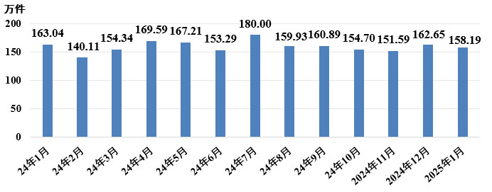 1月,全省12345热线共受理企业群众诉求158.19万件,环比下降2.74%,办结141.49万件,办理中16.69万件,超期率0.01%。见图1。