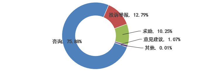 省12345热线共受理企业群众诉求76593件,办结69794件,办理中6799件。从诉求类型来看,咨询类占75.88%,投诉举报类占12.79%,求助类占10.25%,意见建议类占1.07%,其他类占0.01%。见图2。