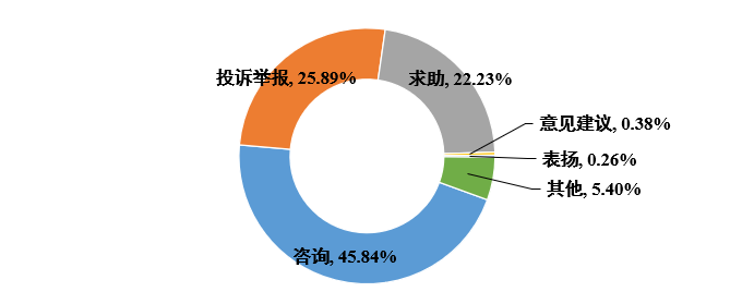 市(州)12345热线共受理企业群众诉求150.53万件,办结134.51万件,办理中16.01万件。从诉求类型来看,咨询类占45.84%,投诉举报类占25.89%,求助类占22.23%,意见建议类占0.38%,表扬类占0.26%,其他类占5.40%。见图3。