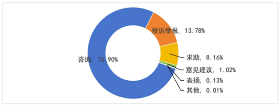 省12345热线共受理企业群众诉求152128件,办结143343件,办理中8785件。从诉求类型来看,咨询类占76.90%,投诉举报类占13.78%,求助类占8.16%,意见建议类占1.02%,表扬类0.13%,其他类占0.01%。见图2。