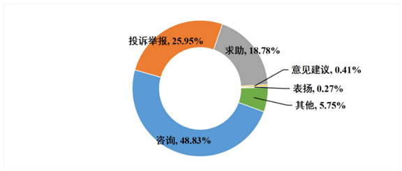 市(州)12345热线共受理企业群众诉求281.58万件,办结270.45万件,办理中11.12万件。从诉求类型来看,咨询类占48.83%,投诉举报类占25.95%,求助类占18.78%,意见建议类占0.41%,表扬类占0.27%,其他类占5.75%。见图3。