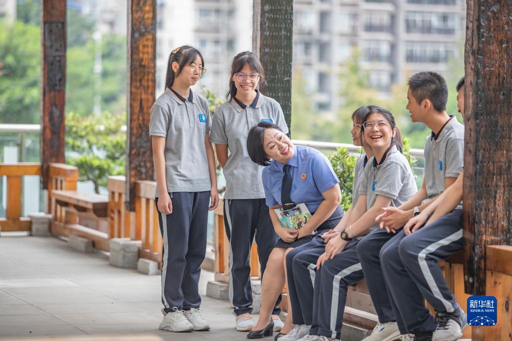 9月20日,在重庆市第三十七中学,梅玫与学生在课间交流。新华社记者 黄伟 摄