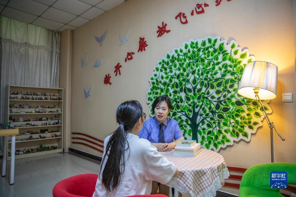 9月20日,在重庆市大渡口区人民检察院“莎姐”谈心室内,梅玫与一名前来咨询的未成年人谈心。新华社记者 黄伟 摄