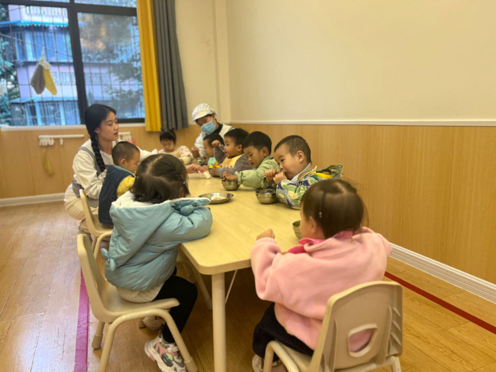 四川省成都市成华区双桥子街道新鸿社区婴幼儿成长中心老师在照顾托小班小朋友吃饭(2023年12月4日摄)。新华社记者 吴晓颖 摄