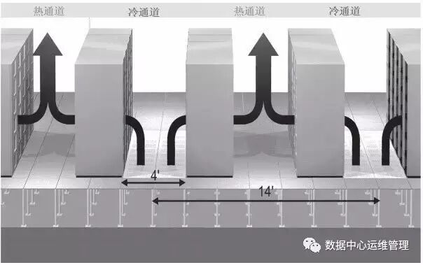 美国2005年4月发布的TIA942《数据申心通信基础架构标准》中要求机房内计算机设备及机架采用“冷热通道”的安装方式。“冷热通道”的设备布置方式,打破常规,将机柜采用“背靠背、面对面”摆放,这样在两排机柜的正面面对通道中间布置冷风出口,形成一个冷空气区“冷通道”,冷空气流经设备后形成的热空气,排放到两排机柜背面中的“热通道”中,通过热通道上方布置的回风口回到空调系统,使整个机房气流、能量流流动通畅,提高了机房精密空调的利用率,进一步提高制冷效果,如下图所示。