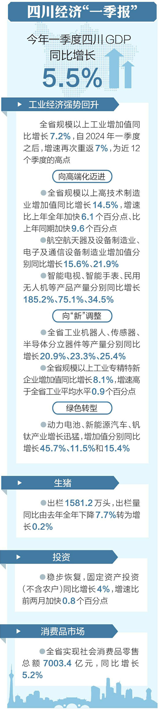 “‘稳中向好’主要表现为4方面。”杨治刚说,即“两新”政策效果好、新质生产力发展好、绿色转型态势好和质量效益改善好。以绿色转型为例,一季度,四川动力电池、新能源汽车、钒钛产业增长迅猛,增加值分别同比增长45.7%、11.5%和15.4%;清洁能源生产优势突出,全省规上天然气产量稳居全国第一,同比增长7.9%。