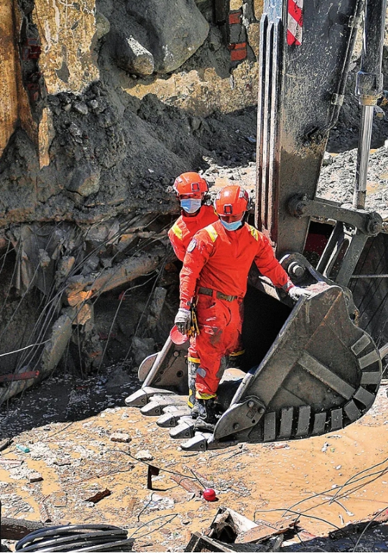 救援人员在四川省康定市日地村一处被泥石流掩埋的建筑内搜救失联人员(2024 年 8 月 5 日摄) 刘坤摄 / 本刊