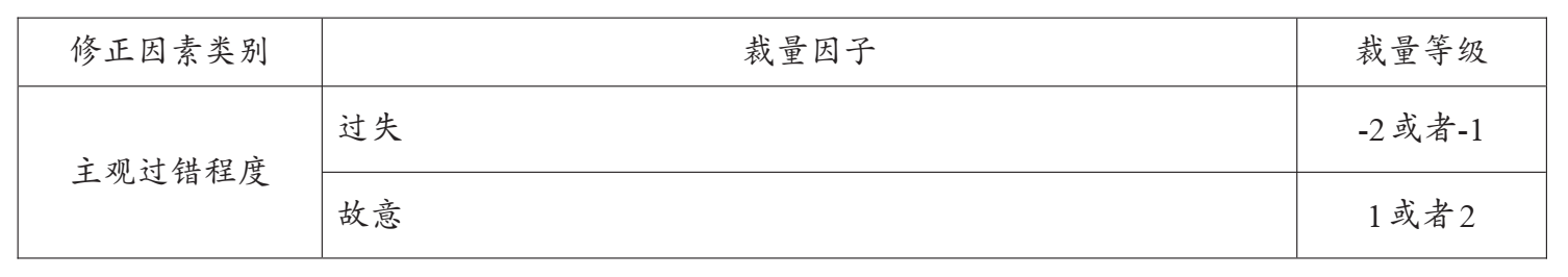 修正因素包括:改正情况、社会影响力、主观过错程度3种,裁量等级数值从-2到2。