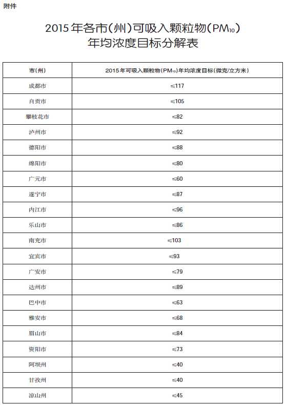 (一)环境空气质量目标。2015年,全省可吸入颗粒物(PM10)年均浓度较基准年下降4%以上,重污染天数有所减少。各市(州)可吸入颗粒物(PM10)年均浓度目标分解详见附件。