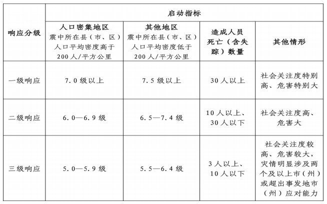 初判指标:人口密集地区发生7.0级以上地震,或其他地区发生7.5级以上地震。
