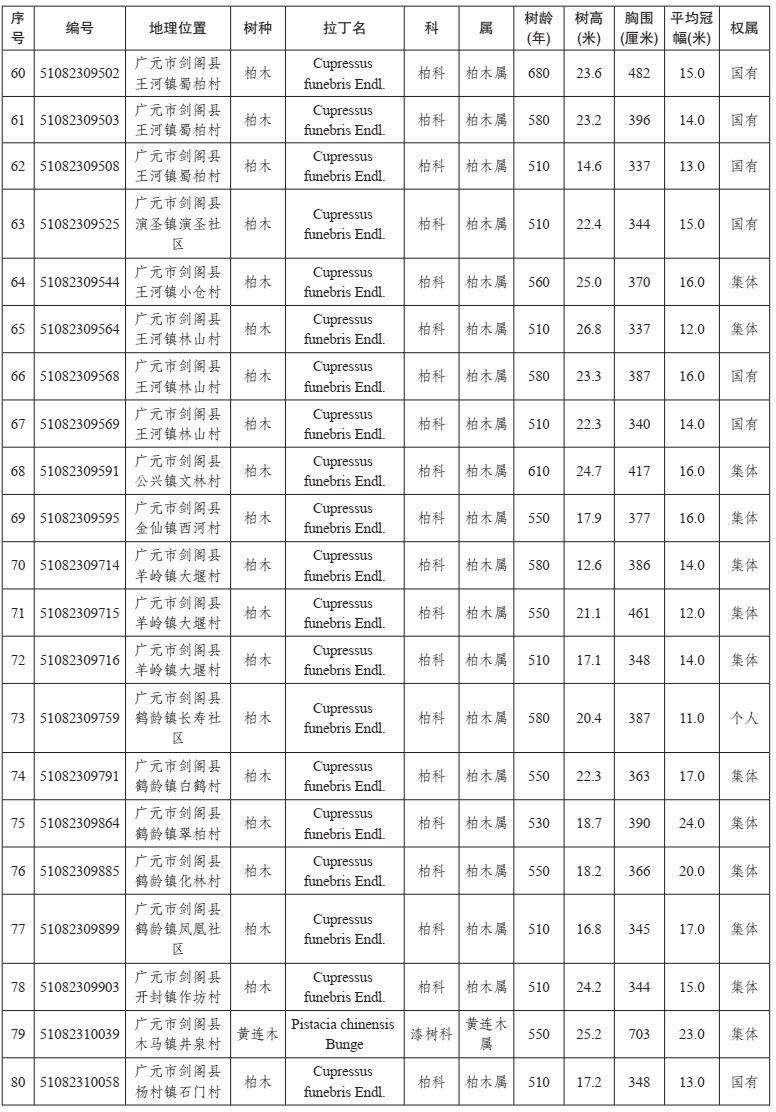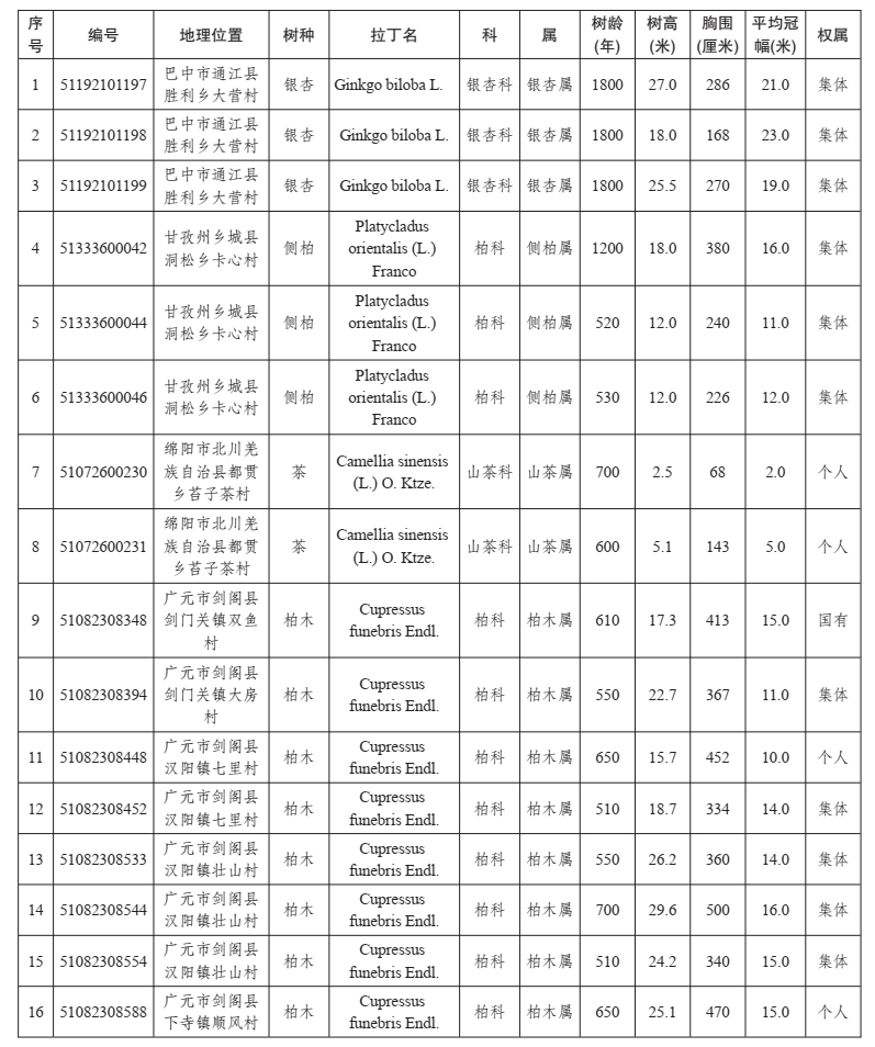 四川省2021年新增一级古树名录(乡村)