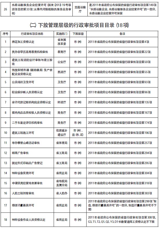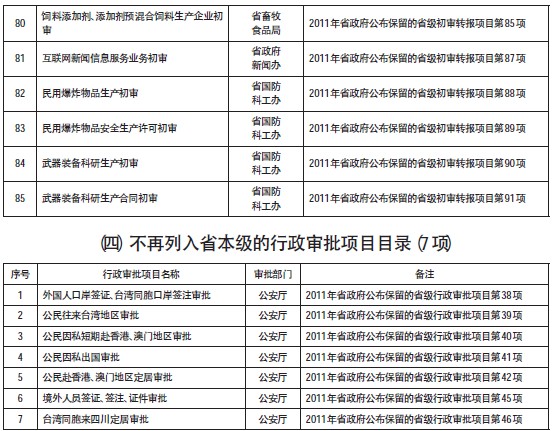 为深入贯彻落实党的十八大和十八届二中全会精神,按照党中央、国务院和省委、省政府关于行政审批制度改革的决策部署,以及《四川省人民政府关于进一步深化行政审批制度改革的意见》(川府发〔2013〕17号)精神,省深化行政审批制度改革领导小组办公室组织有关部门对2011年省政府公布保留的478项行政审批项目进行了全面清理,并与《国务院关于第六批取消和调整行政审批项目的决定》(国发〔2012〕52号)、《国务院关于取消和下放一批行政审批项目等事项的决定》(国发〔2013〕19号)进行了对接。经省政府第10次常务会议审议,决定第一批取消、调整136项行政审批项目。其中,取消26项,下放管理层级18项,转为服务事项85项,不再列入省本级项目7项。