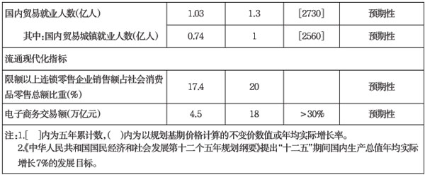 总体规模指标实现翻番。2015年社会消费品零售总额32万亿元左右,年均增长15%左右;生产资料销售总额76万亿元左右,年均增长16%左右;批发零售住宿餐饮业增加值超过7万亿元,年均实际增长11%左右。2015年国内贸易就业人数1.3亿人左右,其中城镇就业1亿人左右,年均增加500万人以上。