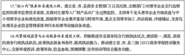 4.加强商品质量安全行业管理。鼓励食品经营企业采用先进技术和管理规范,健全企业进货查验、购销台账等制度。完善食品安全事故处置、信息通报、监测评估体系,提高食品安全风险预警和防控能力。完善药品流通网络和药品流通分类分级管理制度,推进社会零售药店规范管理,制定从业人员职业分类标准和岗位规范,健全药品购销索证索票、出入库及运输安全管理责任制。扶持和规范中药材交易市场,建立中药材流通追溯体系。加强保健食品、化妆品流通监管,探索建设追溯体系。逐步建立肉菜等食用农产品的流通追溯体系。完善酒类流通随附单溯源等管理制度。支持符合条件的生猪等定点屠宰企业升级改造,严格企业准入。完善省、市、县和企业互联互通的屠宰监管系统,建立监管和公共服务网络。整合充实商务领域执法监管力量,严厉打击私屠滥宰等违法行为。
