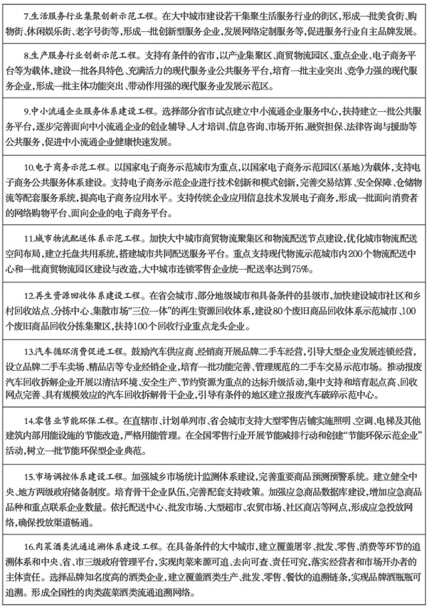 1.推进管理体制改革。放宽垄断专营领域市场准入,深化原油、成品油、食盐、药品等商品流通体制改革,完善重要商品流通体系和管理机制,鼓励民间资本进入流通领域。加快流通管理部门职能转变,强化社会管理和公共服务职能,增加政府对具有公益性质的流通基础设施的投入。加快建立分工明确、权责统一、协调高效的国内贸易管理体制。强化政策制定、执行与监督相互衔接。推动相关行业协会、商会改革和发展,加强行业自律和信用评价,支持行业组织提高服务能力。