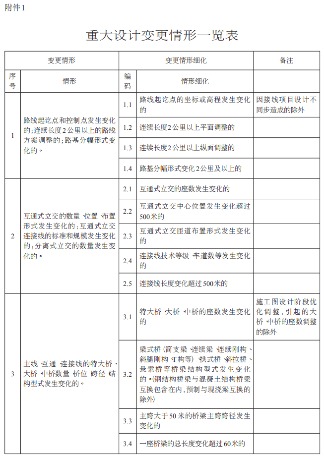 第十条 高速公路建设项目设计变更分为重大设计变更和一般设计变更两类。重大设计变更主要情形有(具体情形详见附件1):